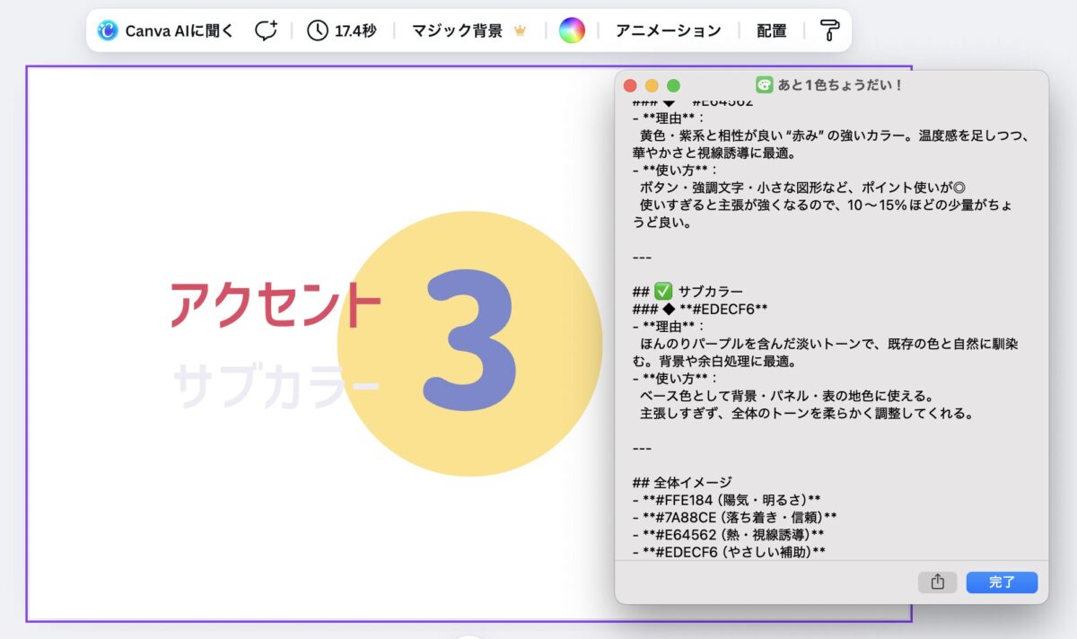 好きなように書いてください。特になければ空欄で大丈夫。汎用性の高い色セットを考えてくれます。終わったら「完了」をクリックしましょう。