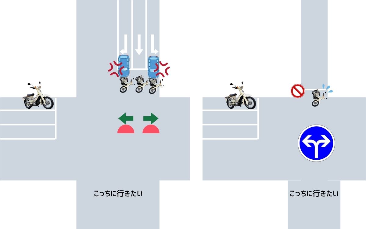 まず図の左。待機車線が3つあると、どうしても50ccは第一通行帯に入ってしまいがちなのですが……。待機車線に右左折専用信号がある場合は、左折する車にクラクションを鳴らされるかもしれません。もちろん右折専用レーンの前で待機したら右折車にクラクションを鳴らされるかも。