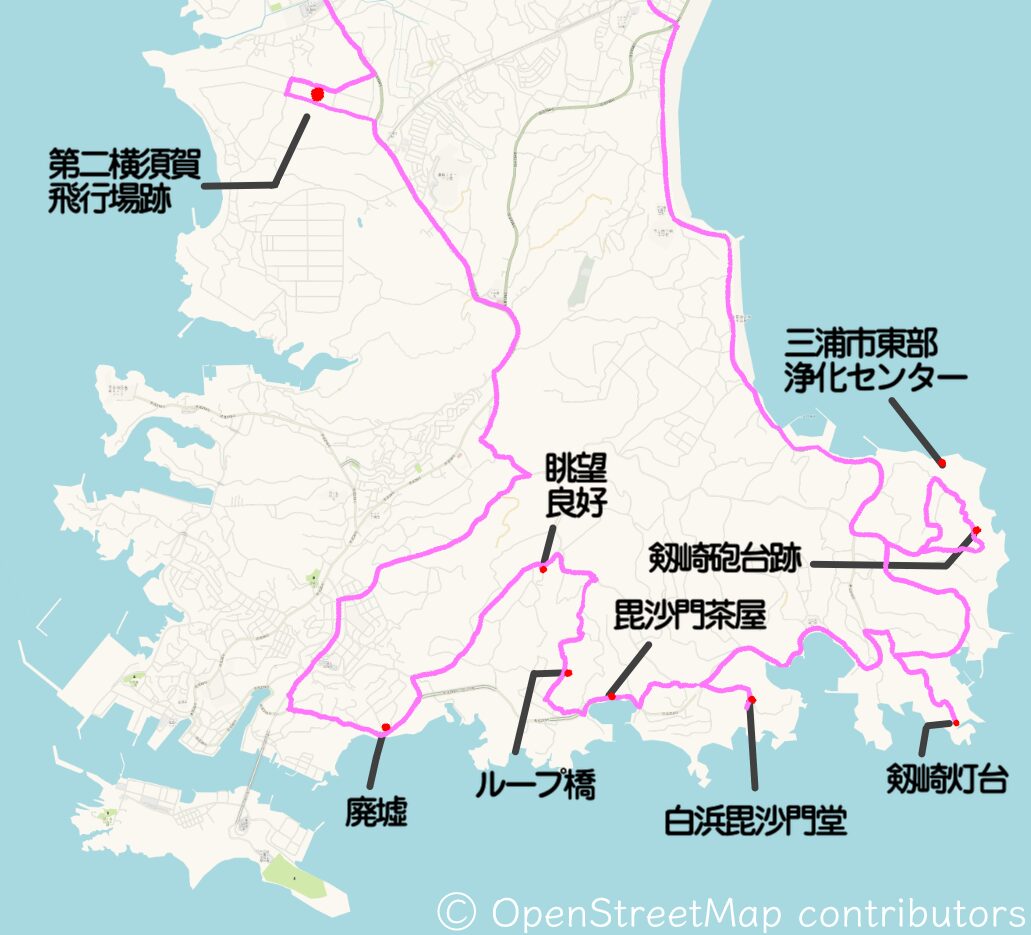 横浜市の自宅を出発し、国道16号線で横須賀へ。途中で国道134号に入り、そのまま津久井浜・三浦海岸に出ました。この地図はちょうど海岸沿いに出たところ(右上)から始まっていますかね。動画もその辺りから収録しています。